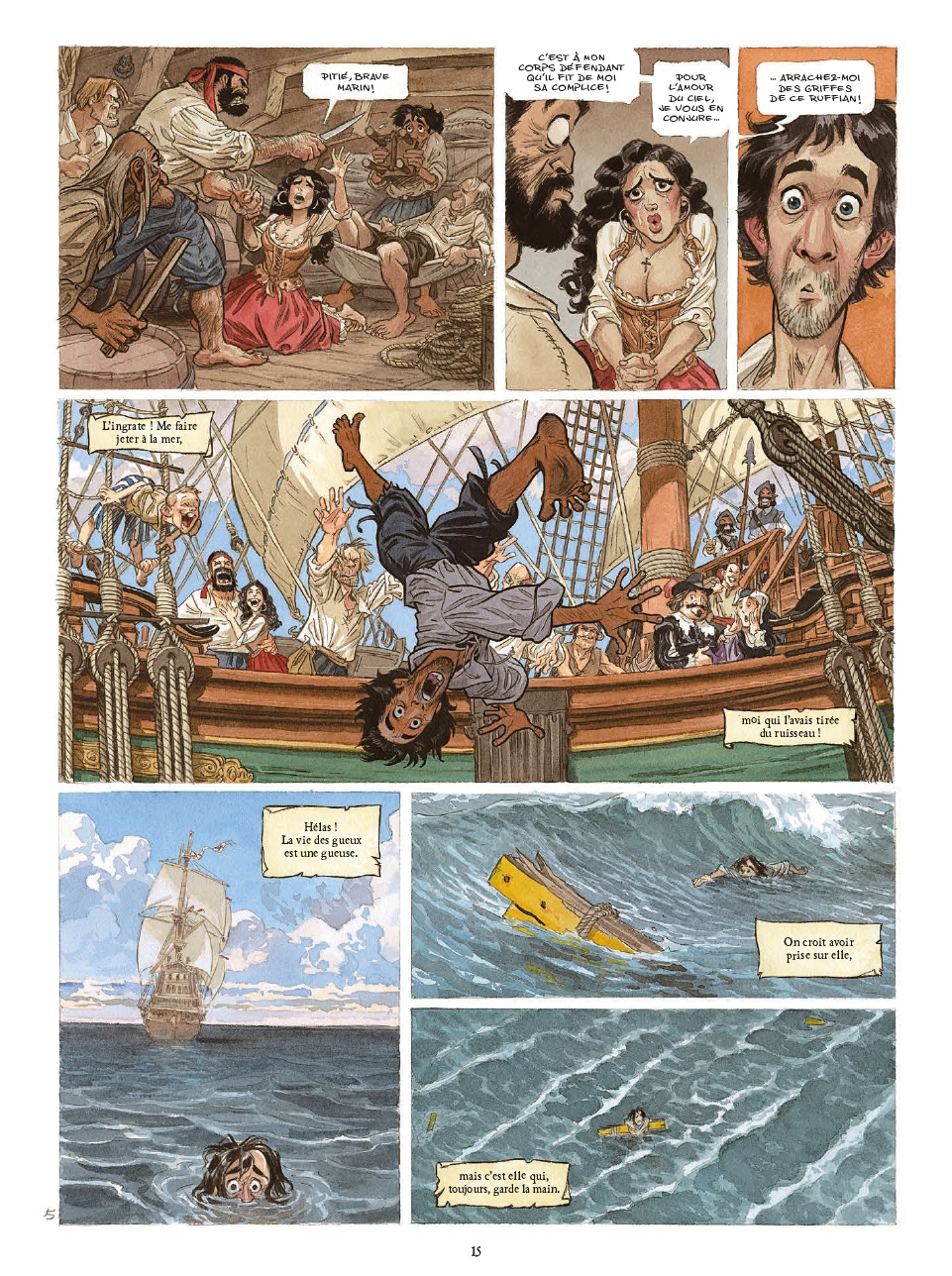 -Alain Ayroles. Le scénario des Inde fourbes regorge de rebondissements et de fausses pistes, de dialogues savoureux, de références artistiques. Comment avez-vous élaboré ce scénario ? Vous êtes vous particulièrement imprégné du style ou du ton de Quevedo ? Et ensuite, avez-vous écrit ce scénario d'un seul coup ou par petits bouts qui ont grossi ?